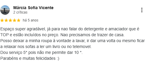 Prestamos serviços de lavandaria self-service, lavandaria tradicional com recolha e entrega (lavagem, secagem e engomadoria), serviços de lavandaria profissional para empresas profissionais como alojamento local, ginasios, restaurantes, etc... e limpeza de tapetes e carpetes.